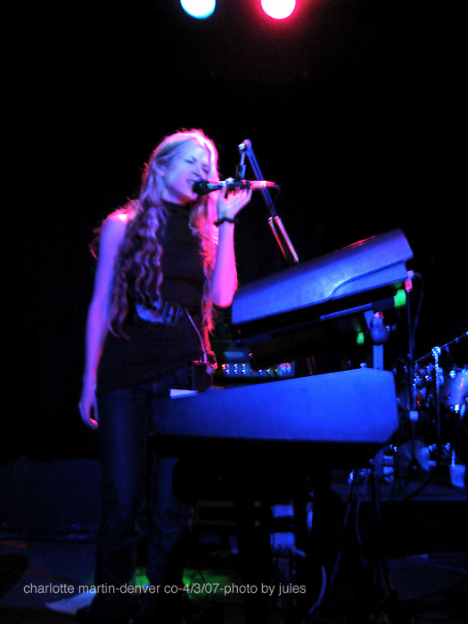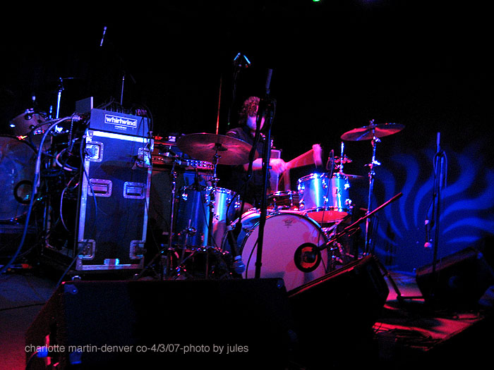 the show was great. even before the show, there were predominantly peeps on line to see char. which was great to see. char sounded great, and it was nice and loud up there. even when her in-ears conked out, she with fern connected to compensate for the loss of the in-ear. char is a trooper! so much energy...favorite part was the 'middle' where she played shadow-bizarre love triangle (eee!! its even better than before and i thought it was pretty great before)-limits w/ running up that hill and then four walls (veins version). just high energy, the young ladies that were there to see veruca were turned into char fans. lots of 'wow!' bizarre love triangle...soo amazing with a fuller drum sound and char doign her own backup vocal (does that make sense? lol). and 'girl i left behind' was a nice surprise, love that last solo virus part. so did the crowd. it was so great to see char again, just singing her heart out and charming the crowd. it was nice to meet so many denver fans. thanks to converted char fans amanda and jennifer, and chrysta and her friend corey for the ride!