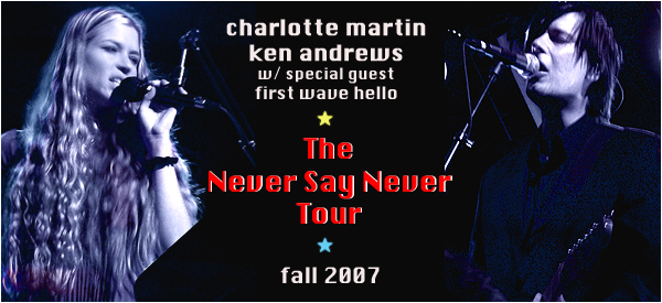 The Never Say Never Tour with Charlotte Martin, Ken Andrews and special guest First Wave Hello travelled across the country on a 22 city tour that brought a wide range of music that rocked. Mixing the Charlotte fans and the Ken fans with some First Wave Hello fans brought out a great mix of music fans. If you went to any of the shows, you were not disappointed. Char and Ken took turns closing the shows and it was surprise every nite, every show. The duets. The band jams. This is part of why I, personally, tour for Charlotte...she makes each show so unique. She had her drummer, the very awesome Fernando Sanchez, with her and together they brought new life to some favorites as well as played some new classics from her new, all covers CD, 'Reproductions.' It was a great tour...a great nite of music with Ken Andrews and his alt-electro rock balancing perfectly with Charlotte's own brand of electro-synth rock goodness. If Charlotte is playing anywhere I can get to, I'm there. Next time, I hope to see all you Char fans out there. I hope to share a show with you and Char. Until next time, relive the tour through setlists, photos, reviews and video from me and hopefully from you! This page will continue to be updated until all the shows have been added below (that's 23 shows!).